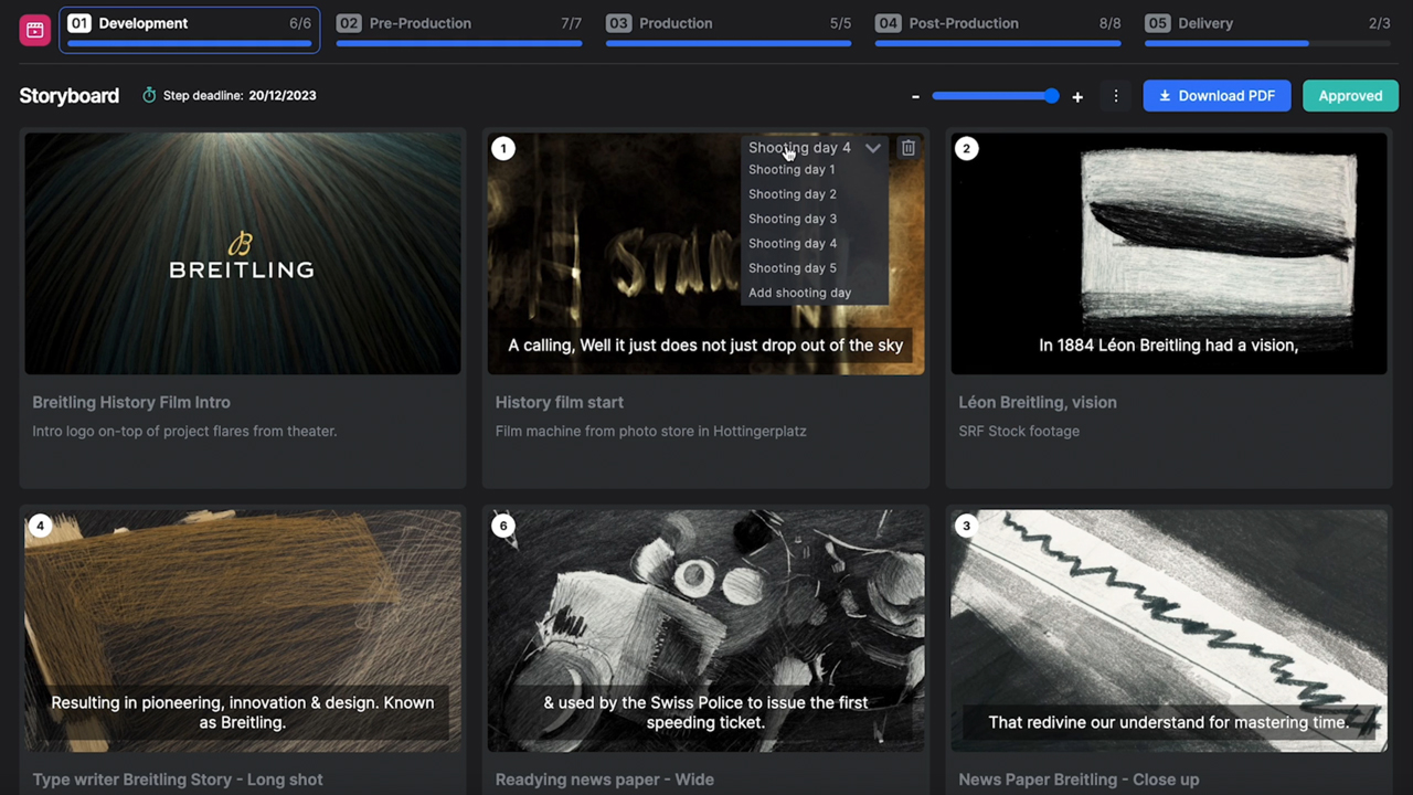 When you select a project from a visual board, as demonstrated above, you will see the entire production process divided into stages we all are familiar with: