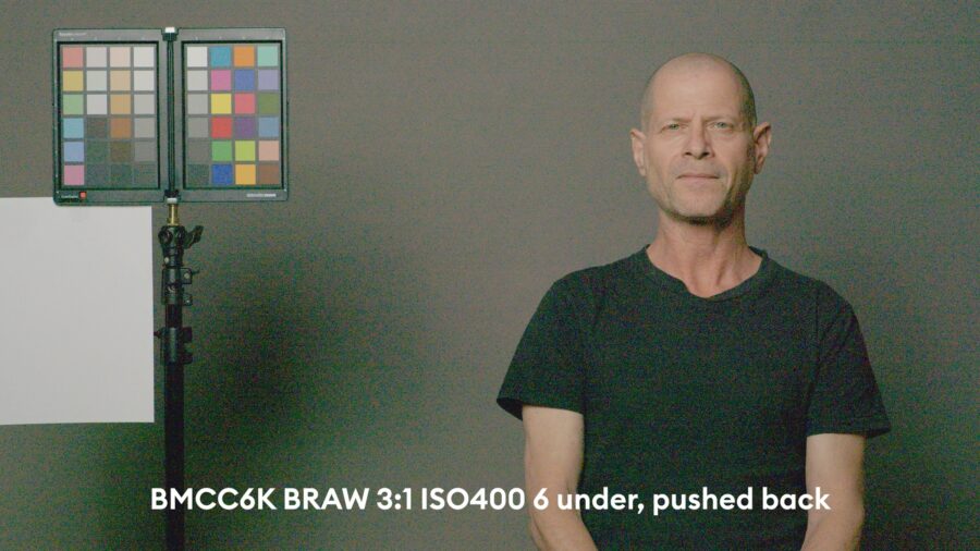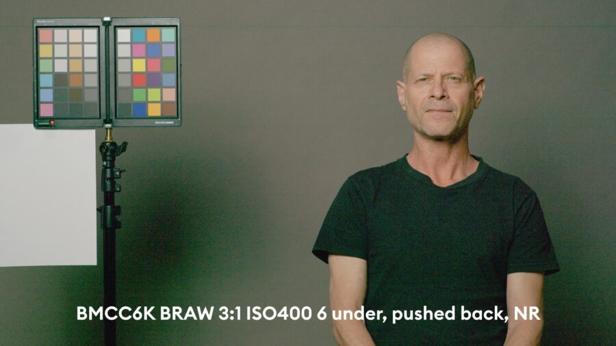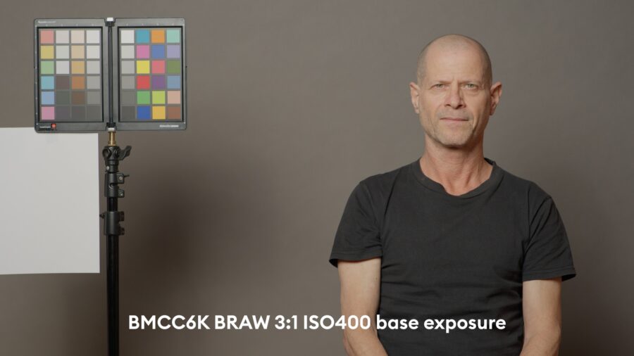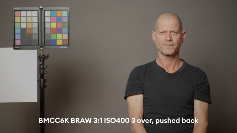 As usual, we overexpose until the red channel is at the cusp of clipping on the forehead of our subject (my dear colleague Johnnie in this case), and then we push it back to base exposure in post. Here, typically some patches of the color checker on the left are clipped. Those can be brought back by using the “highlight recovery” option in the RAW camera tab of DaVinci Resolve 18.6.4 that we used here. However, we only test with “highlight recovery” turned “OFF”, as color accuracy suffers massively with reconstructed color channels (as we wrote in many earlier articles) – but it is a nice option to have to save parts of the image if they are partially clipped.
