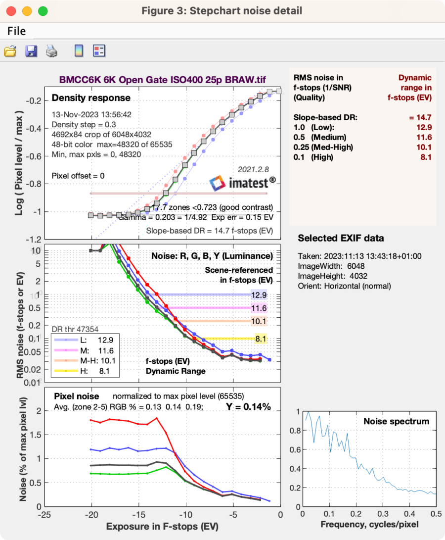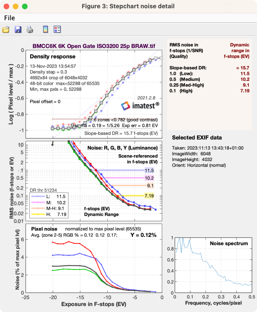 IMATEST calculates 11.6 stops at a signal-to-noise ratio (SNR) of 2, and 12.9 stops at SNR = 1 for ISO400. These are almost exactly the same results that we measured for the BMPCC6K and BMPCC6K Pro (they actually showed 0.2 stops better results at SNR = 2). Also, the noise levels look very similar (see our lab test article here).
